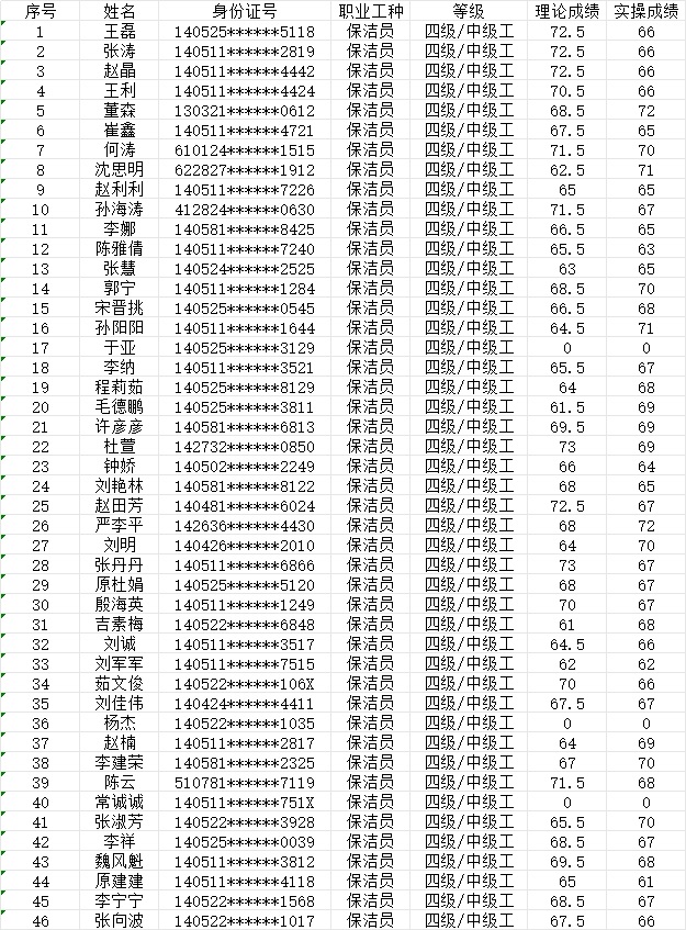 晉城市潔霸清潔服務(wù)股份有限公司職業(yè)技能等級認(rèn)定中心2024年1月21日下午第4批保潔員中級認(rèn)定人員成績公示