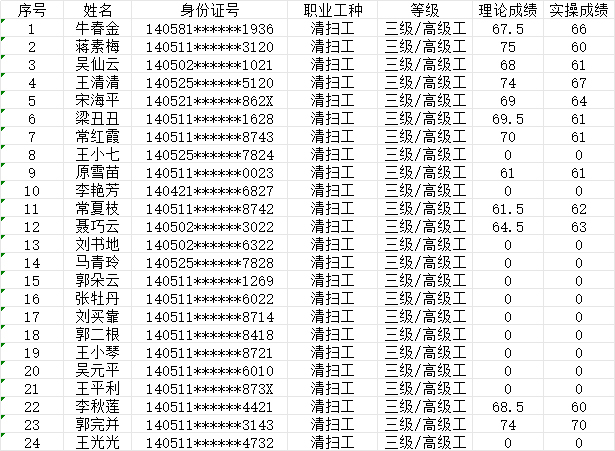 晉城市潔霸清潔服務(wù)股份有限公司職業(yè)技能等級(jí)認(rèn)定中心現(xiàn)將2024630日認(rèn)定人員成績(jī)公示如下: