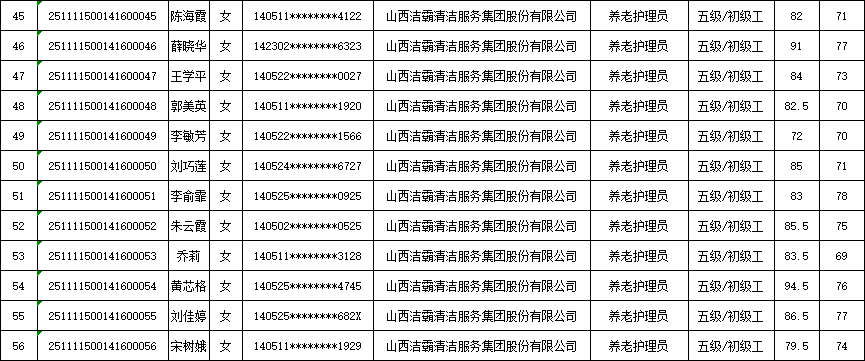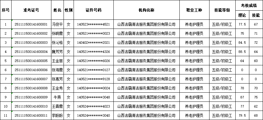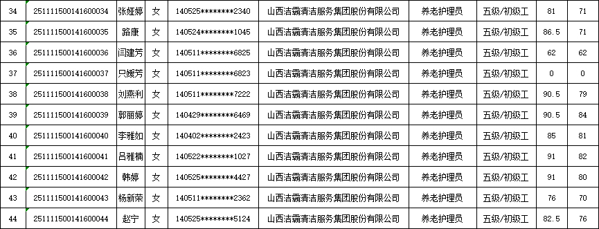 山西潔霸清潔服務集團股份有限公司職業(yè)技能等級認定中心現將2025年11月15日認定人員成績公示如下: